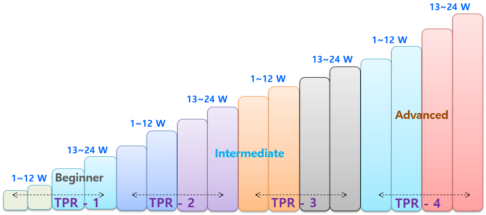 체화 영어 교재는 Level 1~4 단계중 각 단계별 24주 학습 프로그램으로 구성 되어 있습니다.